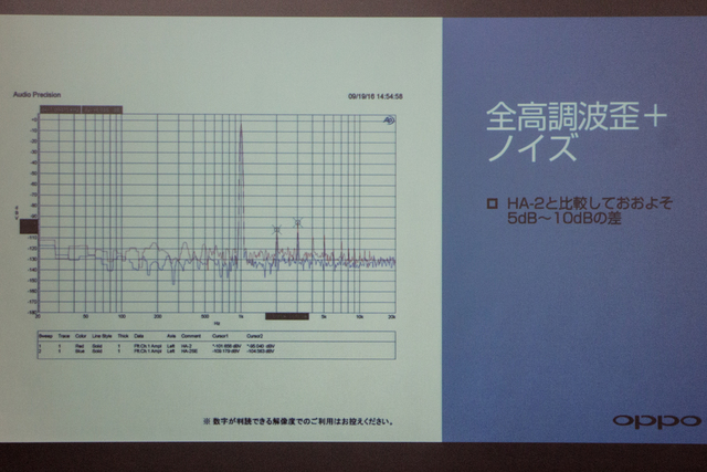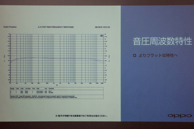 全高調波歪率+ノイズ(THD-N)についても、HA-2比で大幅に歪を低減していることが測定でも明らかになっているとグラフで示された。また、この高調波歪みの抑制の結果、音色の変調が少なくなり、より音楽信号に忠実な再現が可能になったという。音圧周波数特性も、よりフラットな特性を実現している。