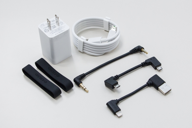 付属品については、新たに両端L字のLightning - USBケーブル、両端L字のUSB OTGケーブル(両端USB micro B端子)が付属。その他、ステレオミニのオーディオケーブル、VOOC高速充電器、データおよび充電用USBケーブル、シリコンゴム・バンド(2個)などが同梱される。