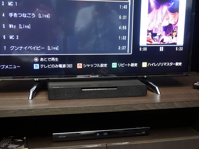 外形寸法430W×50H×130Dmmと小型な点も特徴。テレビ前に設置してもリモコン受光部を隠したりすることがないほか、同社製4Kテレビ“VIERA”「DX750シリーズ」ではスタンド間にすっきり設置できるようになっている。なお横幅はディーガと同じだが、本機は音を出すために振動するため、ディーガと重ねてのスタック設置は推奨していない。