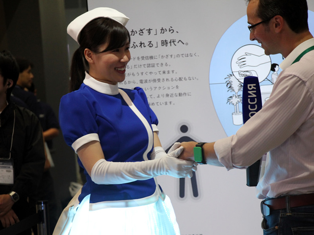 触るだけで各種機器の認証や通信を可能にする、電解通信技術を応用した「人体通信応用デバイス」もデモ。同技術を応用すれば、将来的に例えばレコードやCDに触れるだけでコンテンツを視聴できたり、握手をしただけで名刺データを相手に伝えるなどといったことが可能になるという。