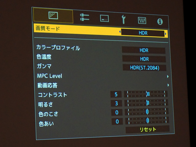 また、カラープロファイル設定での項目は「BT.2020」と「HDR」とを別で用意。シネマフィルターの有無が両者の違いで、「BT.2020」ではフィルターを入れて色を重視、「HDR」ではフィルターなしで明るさ重視の設定になるという。