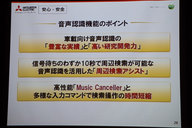 安心・安全機能については、音声認識機能に特に注力。車載向け音声認識の豊富な実績と同社の高い研究開発力が本機に活用して、音声認識機能を立ち上げることなく、会話の中からキーワードを自動認識してすばやく行き先を検索できるという「周辺検索アシスト機能」を実現した。同社は「信号待ちの10秒間で周辺検索ができる」と紹介している。