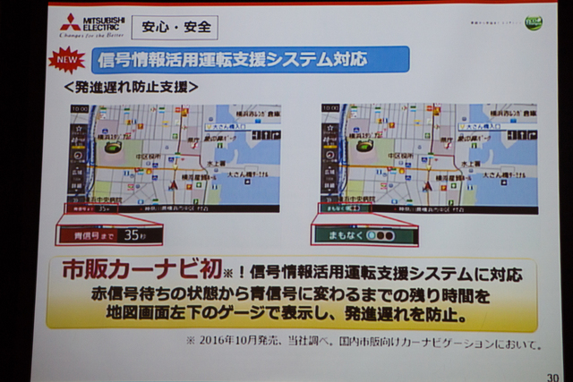 市販カーナビとしては初という、高度化光ビーコンによる信号情報活用運転支援システムへの対応も実現。対応する道路環境において、赤信号待ちの状態から青信号に変わるまでの残り時間を地図画面にゲージで表示してくれる。