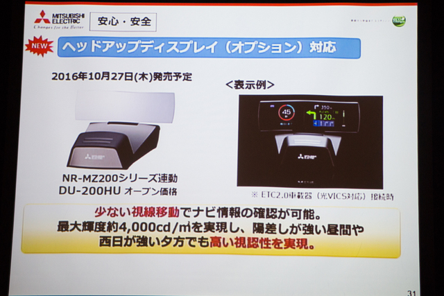 また、少ない視線移動でナビ情報を確認できる、NR-MZ200シリーズ連動のヘッドアップディスプレイ「DU-200HU」も10月27日より発売。本機を用いた場合には、上述の信号情報活用運転システムによる「赤信号減速支援」機能も利用できる、