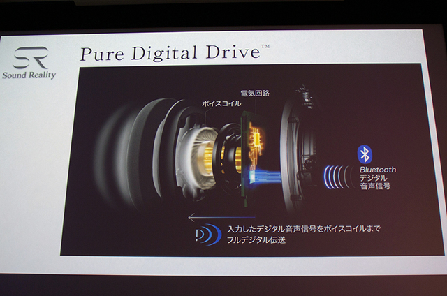 「ピュア・デジタル・ドライブ」は、電気回路内にデジタル信号処理技術「Dnote」を採用することで、デジタル信号をアナログに変換することなく、L/Rの信号をそれぞれ独立させた状態で専用D/Aドライバーのボイスコイルに入力。デジタル信号をそのまま振動板を振動させる力に変換することで、鮮明な音を実現することができるという。