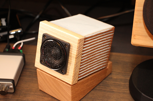 MH Audioは、6階ロビーに設けたブースにて、木製スピーカー「WAON(和音)」の新筐体を採用した2モデルと、陶器を使用したスピーカー「KION(輝音)」などを展示している。