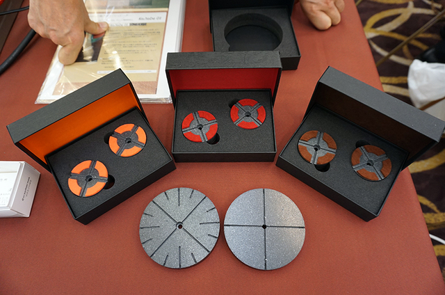 奏KaNaDeは、新しいスピーカー用インシュレーターを参考出展していた。11月頃に発売予定で、ペア32,000円(税込)。最終研磨は人の手で行うため、一日に2ペアしか製作できないのだという。インシュレーターの両端で厚みの誤差は数ミクロンしかないとのこと。