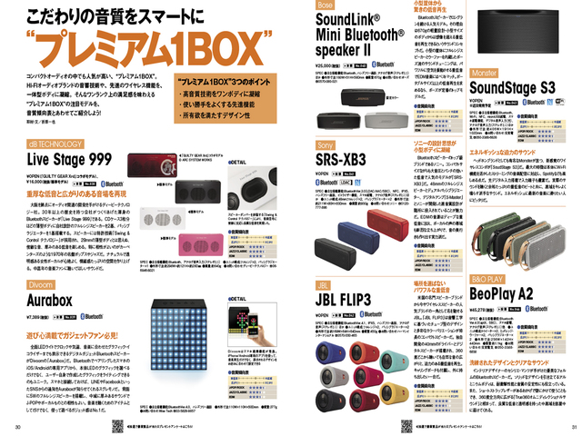 先週末より、コンパクトなオーディオの情報を集めたフリーマガジン「プレミアムコンパクトオーディオガイド」が、全国のヨドバシカメラ、ビックカメラの店頭にて配布をスタートしました! 今号では、ワイヤレスでハイレゾ相当のクオリティのサウンドが楽しめるソニーの「h.ear go(SRS-HG1)」、「SRS-ZR7」をはじめ、新色が登場して注目を集めるB&O PLAY「BeoPlay A1」など、人気のBluetoothスピーカーを数多くレビューしています。