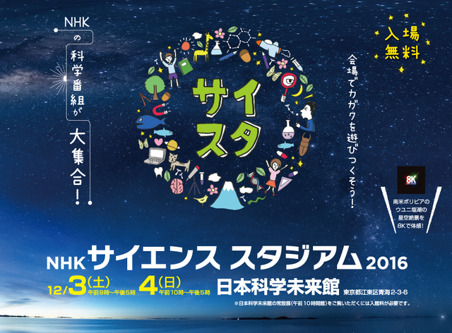 日本科学未来館とNHKは、体験型科学フェスティバル「NHKサイエンススタジアム2016」を12月3日(土)と4日(日)に開催する。イベントでは8Kスーパーハイビジョンの上映や、満点の星空を8K映像で体験するコーナー、VR体験展示なども行う。イベントへの入場は無料。日本科学未来館の常設展示を見学する際には別途で入場料が必要となる。
