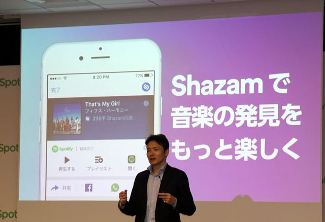 そのほか本日の発表会では、新たにアプリ「Shazam」との連携も発表された。Shazamはマイクから入力された音を解析し、アーティスト名や曲名などの楽曲情報を表示するもので、世界中で10億ダウンロード以上されている人気アプリ。楽曲を調べた際、Spotify上にあるものはすぐに再生することが可能になった。