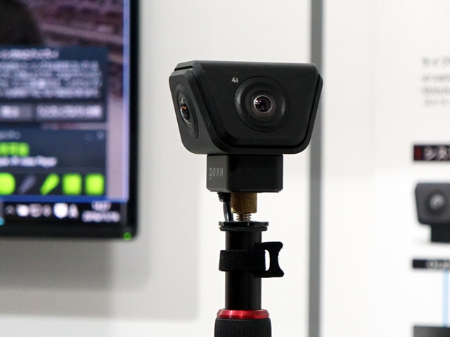 パナソニックは4K/30pの360度映像をライブ配信できる全天球カメラシステムを参考展示。同システムでは4眼カメラのAE/AWBを協調制御し、継ぎ目のない自然な映像を実現可能だという。