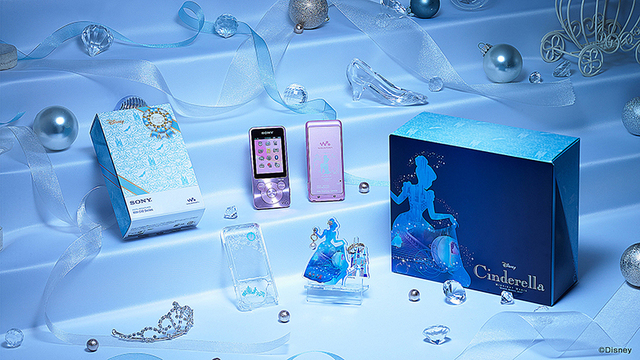 本体はオリジナルデザインのボックスに収めて配達。シンデレラをデザインしたオリジナルウォークマンスタンドと、オリジナルクリアケースも同梱される。