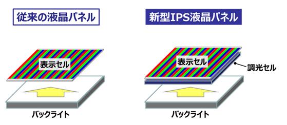 パナソニックのIPS液晶技術をベースに、画素ごとにバックライト光量を制御できる新開発の調光セルを内蔵。調光セルには表示セルとは光透過特性が異なる液晶材料を使用し、それぞれを独立制御している。これにより光漏れを大幅に抑制し、きめ細かな階調表現を実現。コントラスト比も100万対1とした。
