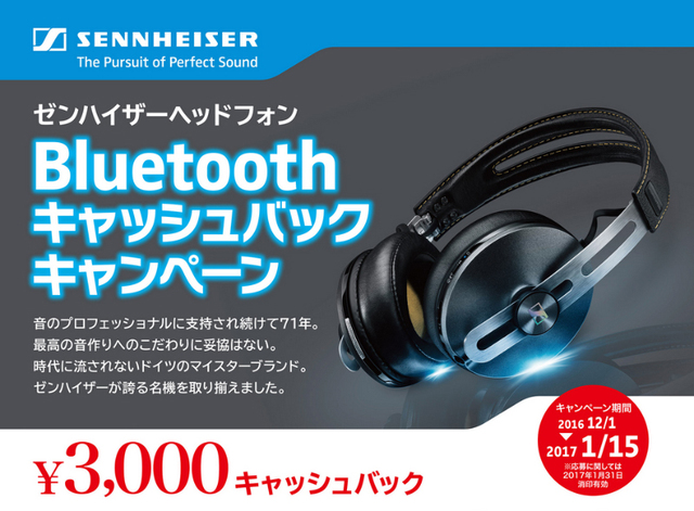 ゼンハイザージャパン(株)は、「ゼンハイザーヘッドフォン Bluetoothキャッシュバックキャンペーン」を本日12月1日から開始した。
