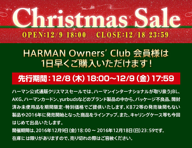 ハーマンインターナショナルは、直販サイトにて同社取扱製品が特価で購入できるクリスマスセールを12月9日(金)18:00からスタートする。開催期間は12月18日(日)23:59まで。なお、HARMAN Owners' Club会員には、1日早い本日12月8日18:00から先行販売を行っている。