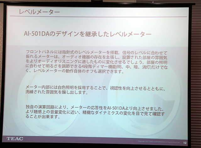 デザイン面では、Referenceシリーズのアイコンとなっているアナログレベルメーターが特徴。本機では精悍な表情をもたせたいという狙い、また視認性の高さから白色照明を採用。メーターのディマーやオン/オフも可能となっている。