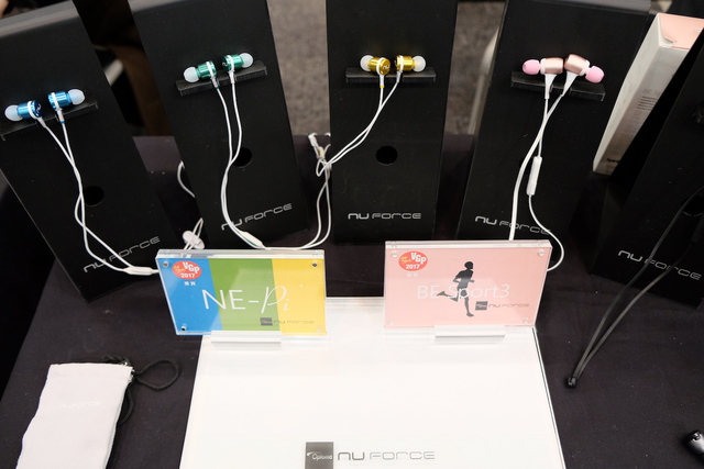 スタンダードカラーの5色のほか、日本限定カラーとしてイエローを用意。イエローに関してはキャリングナイロンケースも赤白の特別色となる。そのほか、NU FORCEブランドのBluetoothイヤホン「BE Sports3」や「NE-Pi」なども試聴機が用意されている。