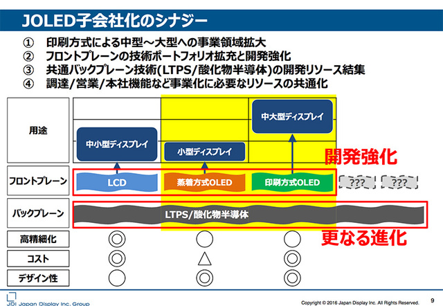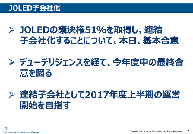 JDIがJOLEDの議決権51%を取得し、連結子会社とする計画で、今後資産査定を行い、2016年度中の最終合意を図る。その後、2017年度上半期には連結子会社としてのJOLED運営開始を目指す。