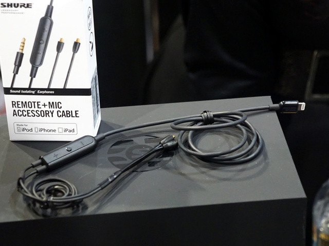 Shureは、マイクを始めとする業務用機器やポータブルアンプ「SHA900」などとともに、iPhone用マイクリモコンを装備したリケーブル「Remote + Mic Accessory Cables」2種を参考展示。