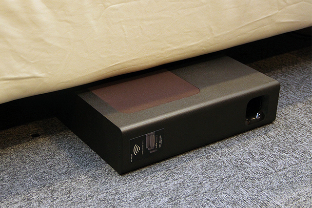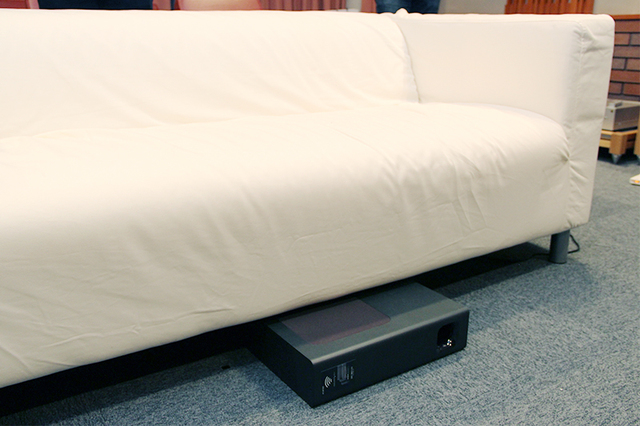 サブウーファーは縦/横置きに対応し、自由な設置が可能。横置き時には高さ約95mmと、ソファ下に設置しやすい高さ100mm以下の薄さを実現している。高さ100mmというのは家具下収納に多いサイズで、同社が調べたところによると約2/3のソファは脚の高さが100mm以上だという。また自動掃除ロボットのルンバも高さは92mmと100mm以下で設計されており、そうした家具の視点から設置性の向上を図り設計が施されている。