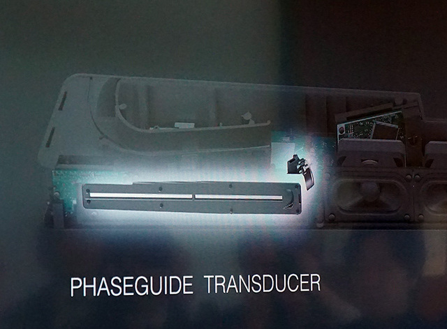 SoundTouch 300には、サウンドクオリティの向上に対する技術が数多く搭載される。メッシュ状の無数の穴で覆われた構造の「PhaseGuide アレイ」は、再生音を部屋の狙った場所へビームのように送り込み、任意の反射音を作り出すというもの。これにより「ホームシアターシステムに重要な、シーンの場に自分がいるような、包み込まれるような体験ができる」としている。会場ではレーザーポイントを当てた場所から音が聴こえるかを実験するデモが行われたが、指し示す場所に音の発生源が動くことが実感できた。