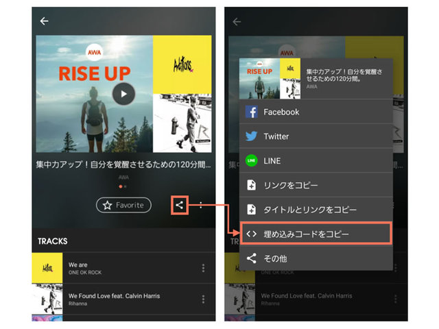 AWAで配信されている音源の“埋め込みコード”を任意のWEBページに貼ることで、ホームページやブログなどに音楽プレイヤーを表示させることができる新機能。“埋め込みコード”は、「楽曲」、「アルバム」、「アーティスト」、「プレイリスト」に対応しており、表示させたいコンテンツを選ぶことができる。