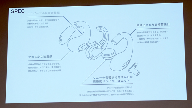 ソニーの音響技術が活用されたφ9mmドーム型・ダイナミックドライバーユニットによる音響性能を持ち、鼓膜への負担が少なく、長時間使用しても疲れにくいという。また汗で耳孔が蒸れにくく、コードの擦れで起こるタッチノイズや、自身の呼吸がこもって聴こえる不快感を防ぐことができるとしている。