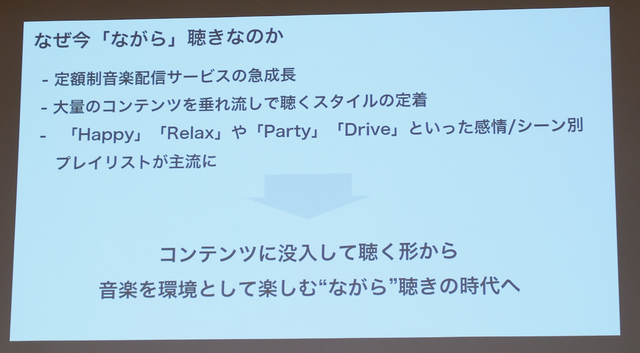 サウンドイヤカフの開発コンセプトについて、三原氏は「定額制音楽配信サービスの急成長や、ユーザーの感情やユースケース別のプレイリストが主流になってきているなど、音楽を環境として楽しむ“ながら聴き”のスタイルに変化してきている」と現在のリスニングスタイルについて言及。