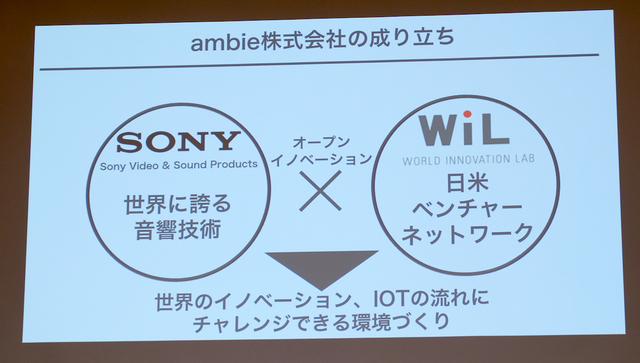 松本氏はambieという会社について、「これからの日本型イノベーションのあり方として、大企業とベンチャーを連携させたオープンイノベーションがWiLの趣旨。ambieは、ソニーが持つ世界に誇る音響技術を、日米ベンチャーネットワークを持つWiLと連携させることで、世界のイノベーション、IoTの流れにチャレンジしようと設立した」とコメント。