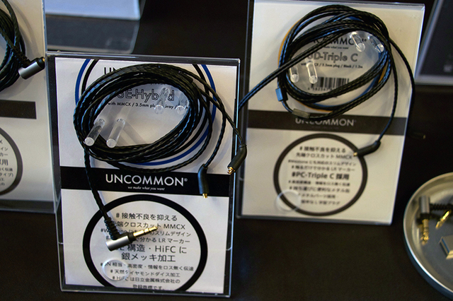 ケーブルブランド「UNCOMMON」では、線材にPC-Triple Cを採用したモデルとHiFCに銀メッキ加工を施したハイブリットモデルの新製品を参考出展。こちらも3月頃の発売を予定している。同社のMMCX端子は十字に切り込みが入っており、接触不良が起きにくくしっかりした接続が可能で、取り回しやすさや使い勝手の良さが人気とのことだ。