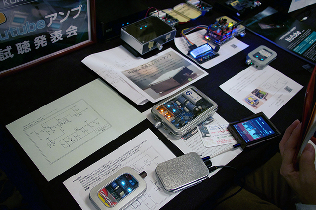 また、KORG社と協賛して「nutube」を使用した自作アンプの展示、販売スペースも展開。思い思いの自作アンプが7台出展、聴き比べなどが可能になっていた。