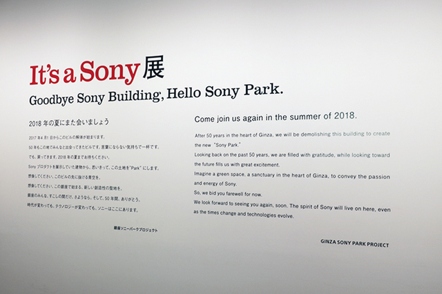 「It’s a Sony展」は、2017年4月から予定されている銀座・ソニービル建替えに際してのカウントダウンイベント(公式サイト)で、Part-1と位置づけたイベント前半では、ソニー創業以来の製品や当時の広告などを展示。ソニーの「歴史」をテーマとして展開した。これまでにのべ96万人が来場したとのこと。