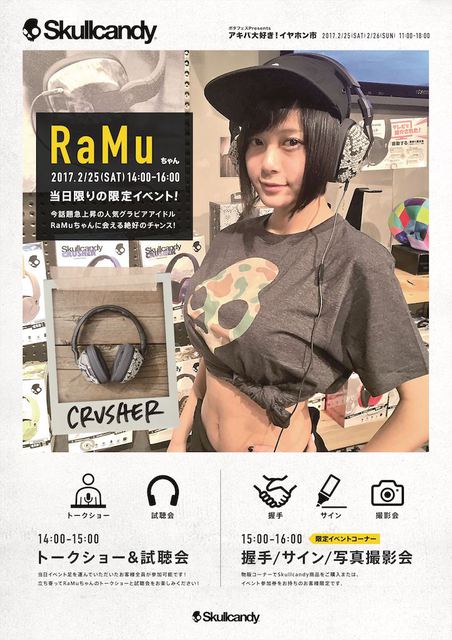 また、週刊プレイボーイによる2017年新人グラドル番付で「(東)横綱」に選ばれ、プロが選ぶアイドルDVD賞で新人賞を受賞したRaMuが、Skullcandyブースに参加。