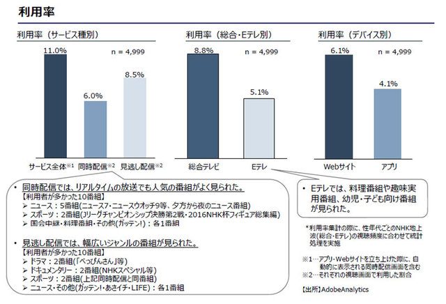 今回は総合テレビに加えて、Eテレも初めて実験の対象とした。また、見逃し配信も初の試みとなった。同時配信または見逃し配信を一度でも利用したのは11%。同時配信の利用者は6%、見逃し配信の利用者は8.5%だった。