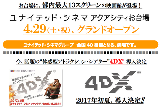 東京・お台場にある商業施設「アクアシティお台場」内に、シネマコンプレックス「ユナイテッド・シネマ アクアシティお台場」が4月29日(土)にオープンする。