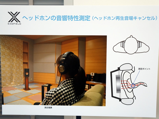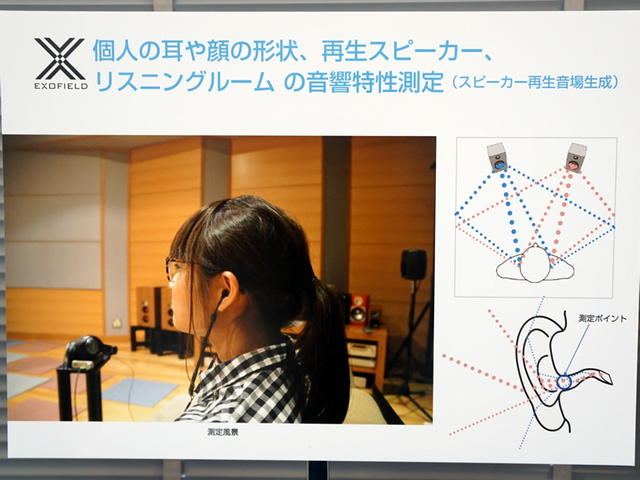 これに対し、今回の「エクソフィールド」では、個人の耳や顔の形状だけでなく、使用するヘッドホン、さらには基準となる再生スピーカーやリスニングルームを含む全ての音響特性を測定、解析し、個人に最適にカスタマイズされた信号処理を行う。これにより、従来のヘッドホン頭外定位音場とは異なり、各ユーザーに応じた最適な音場を実現したという。