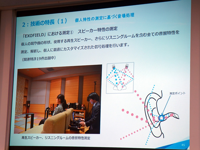 本技術は上記のようにユーザーごとに測定を行って、その測定結果をもとに音場処理を施すことが大きな特徴。従来のヘッドホンにおける頭外定位技術は、標準化された頭部伝達関数を用いて演算処理を行っていたため、耳や顔の形状などの個人の特性までは反映することができず、各ユーザーに最適な効果を発揮することは困難だったと、同社は説明。