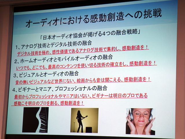 こうした状況に対し、オーディオメーカーなどは“感性価値”を追求することが重要だと校條氏は提言。「アナログ技術とデジタル技術の融合」「ホームオーディとモバイルオーディオの融合」「ビジュアルとオーディオの融合」「ビギナーとマニア、プロフェッショナルの融合」という4つの融合戦略を掲げ、これらで感性価値を追求し、オーディオにおける“感動創造”に挑戦していくべきだとした。