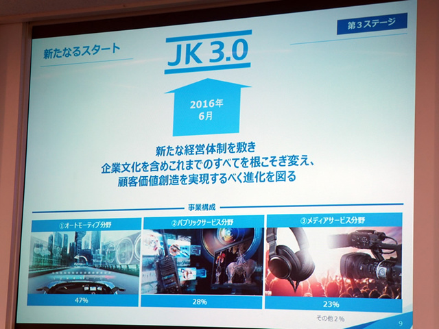 同社では、日本ビクターとケンウッドがそれぞれで活動していた2007年までを「JK1.0」時代、経営統合した2008年から2016年までを「JK2.0」時代、そして経営体制を新たにした2016年6月からを「JK3.0」時代だと定義付けていると説明。