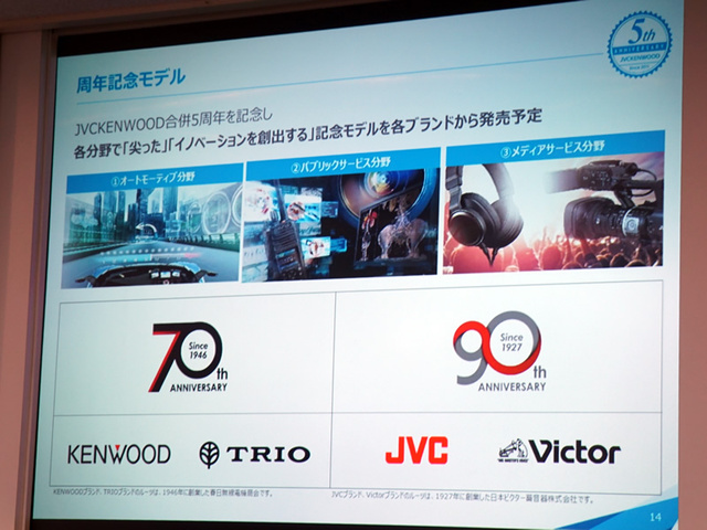 JVCケンウッドは、ビクターブランドの復活を発表。また、ケンウッドの創立70周年、JVC(日本ビクター)の創立90周年を記念したモデルをJVC、ケンウッド、ビクターの各ブランドから発売する。