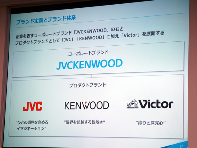 ビクターブランドは、JVCブランドとケンウッドブランドに当てはまらない、独創的な製品を展開するブランドとして展開するとのこと。今後は、JVC、ケンウッド、そしてビクターの3ブランドで製品を展開していく。