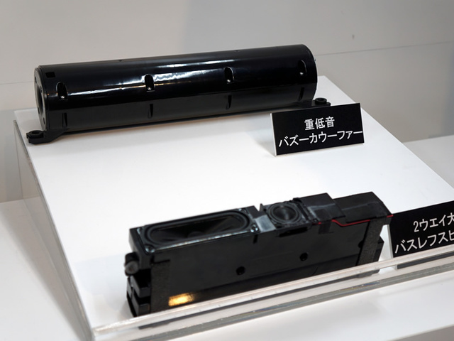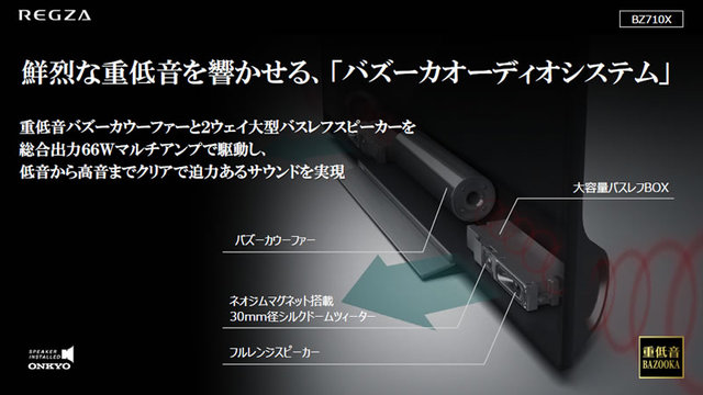 かつて東芝がテレビ用ブランドとして使用していた「BAZOOKA」が、新型テレビのスピーカー名として復活した(※テレビブランドとしての復活ではない)。ネオジムマグネット搭載30mm径シルクドームトゥイーターとフルレンジスピーカーによる2ウェイバスレフスピーカーと、“バズーカウーファー”を総合出力66Wのマルチアンプで駆動する「バズーカオーディオシステム」により、低音から高音までクリアで迫力あるサウンドを実現したとしている。