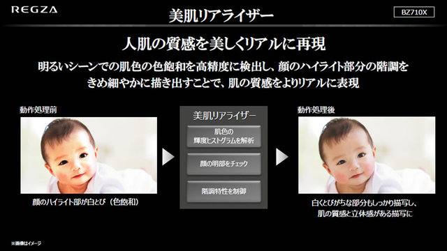 また、有機ELモデル「X910」や本機より上位の液晶モデル「Z810X」と同様に、「美肌リアライザー」も搭載。明るいシーンでの肌色の色飽和を高精度に検出し、顔のハイライト部分の階調をきめ細やかに描き出すことで、肌の質感をよりリアルに表現するという。