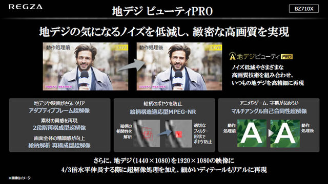 「アダプティブフレーム超解像」や「2段階再構成型超解像」「絵柄解析 再構成型超解像」など、ハイレンドモデルで搭載している高画質化技術を本機も継承。絵柄のボヤケを防止する「絵柄構造適応型MPEG-NR」、アニメやゲーム、字幕をなめらかにする「マルチアングル自己合同性超解像」も備えている。
