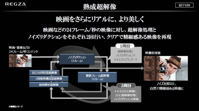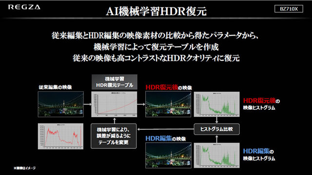 そのほか、映画などの24フレーム/秒の映像に対し、超解像処理とノイズリダクションをそれぞれ2回行う「熟成超解像」や、機械学習によってHDR復元テーブルを作成した「AI機械学習HDR復元」も搭載している。