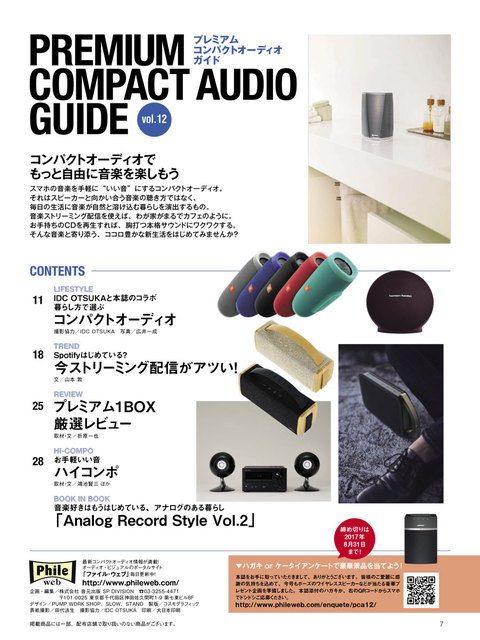 また外見こそ一般的なコンパクトスピーカーでも、中身の進化はとどまることを知りません。昨今は「Spotify」や「Google Play Music」、「AWA」といった音楽ストリーミング配信と連携する機能を搭載するモデルが増加中です。そこで、音楽サービスをガイドする特集や、対応製品のご紹介も掲載しました。各サービス会社に所属する音楽のプロ達がオススメする心地よい楽曲をBGMとして再生すれば、自宅がまるでカフェのように早変わりします! この新しい音楽スタイル、ぜひとも体験して欲しいです。