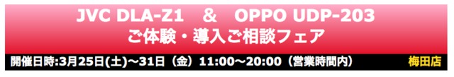 アバック梅田店は、JVCのプロジェクター「DLA-Z1」とOPPOのBDプレーヤー「UDP-203」を組み合わせた視聴会を3月25日(土)〜31日(金)にわたって開催する。