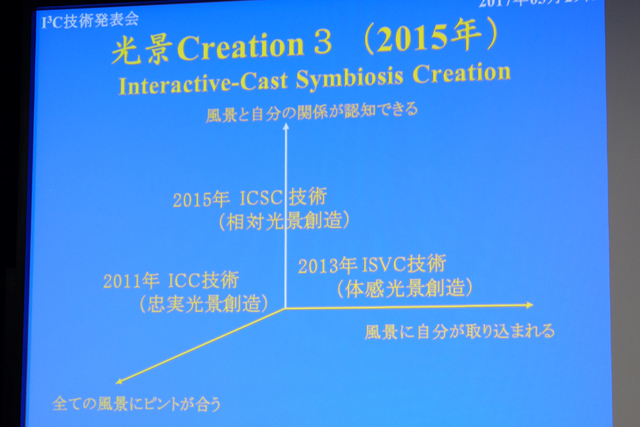 そして2015年のICSC技術では「オブジェクトと自分の関係が認知できる、相対光景の創造。これまではカメラで撮影された映像カメラが置かれた位置で撮影されたものを忠実に再現してきたが、この技術ではその位置に縛られず、自分がその場所に行き、見たいところを注視したかのように感じられる」と述べた。
