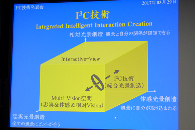 発表会にて登壇したアイキューブド研究所代表の近藤哲二郎氏は、今回開発されたアイキューブドシー技術は、「忠実光景を創造するICC技術、体験光景を創造するISVC技術、相対光景を創造するICSC技術の3つを兼ね備え、そして超えるような、まったく新しい技術」と紹介した。