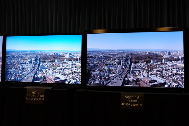 デモでは、ディスプレイにアイキューブドシー技術を適用した映像には4K-SDR 100nitのモニターを使用し、比較用のリファレンスとして4K/HDR 510nitのTVが用意された。映像はアイキューブド研究所の入るビルから撮影された街並みで、4K非圧縮のもの。まずアイキューブド技術を使用しない状態では、ディスプレイの輝度の差から、リファレンスのTVの方が圧倒的に明るく見える。